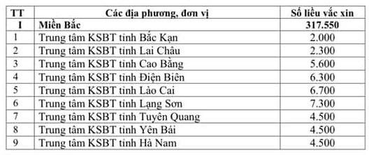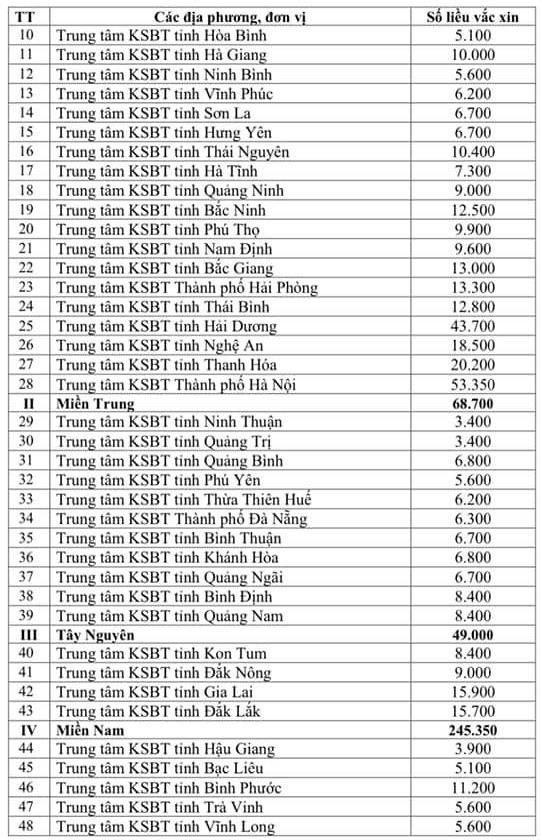 Bên cạnh đó, 28 Trung tâm Kiểm soát bệnh tật miền Bắc sẽ được phân bổ 317.550 liều; 11 CDC miền Trung: 68.700 liều; 4 trung tâm CDC Tây Nguyên: 49.000 liều; 20 CDC miền Nam: 245.350 liều.