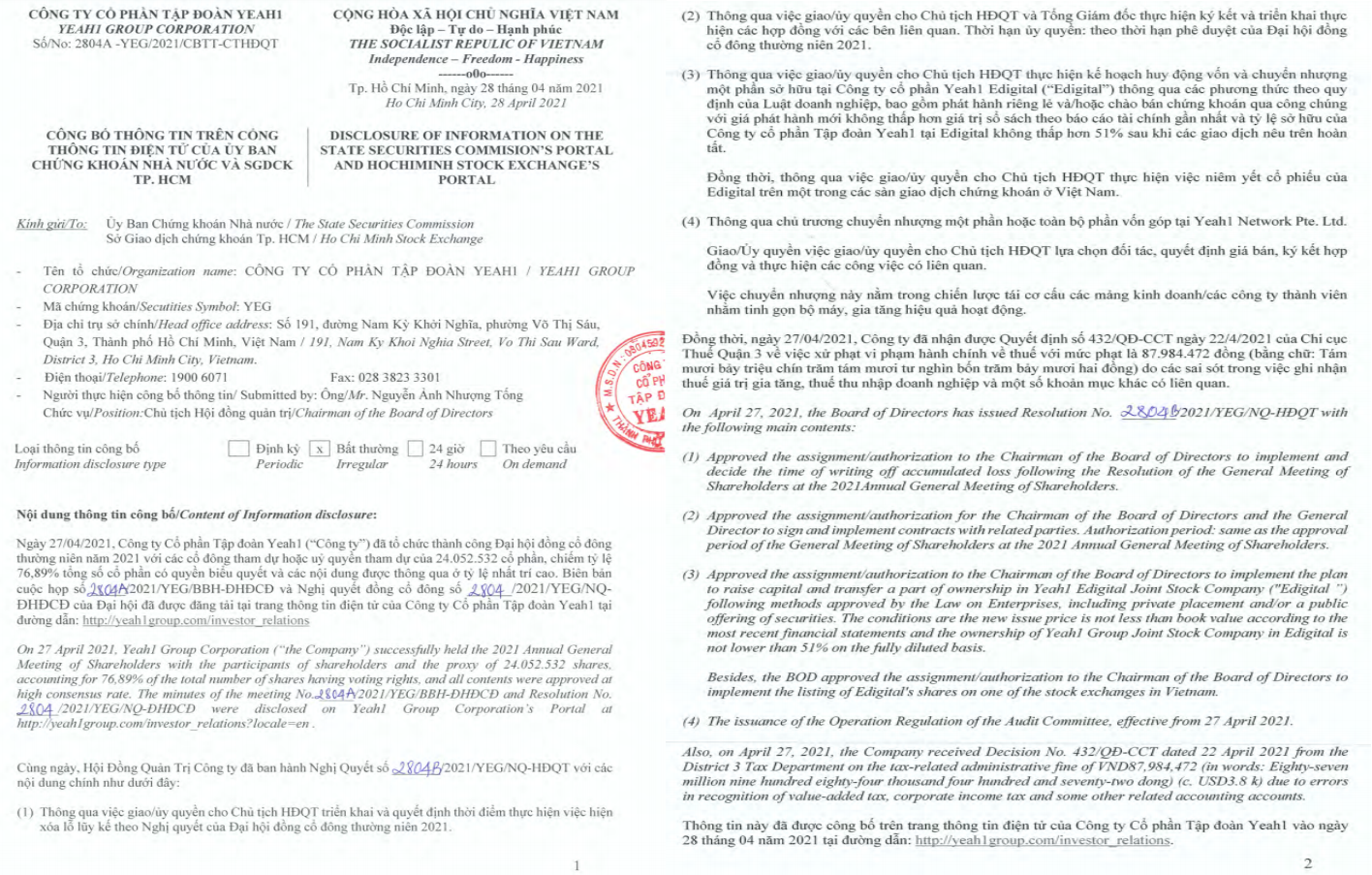 Chi cục Thuế quận 3, TP HCM vừa có Quyết định về việc xử phạt vi phạm hành chính về thuế đối với CTCP Tập đoàn Yeah1 (YEG).