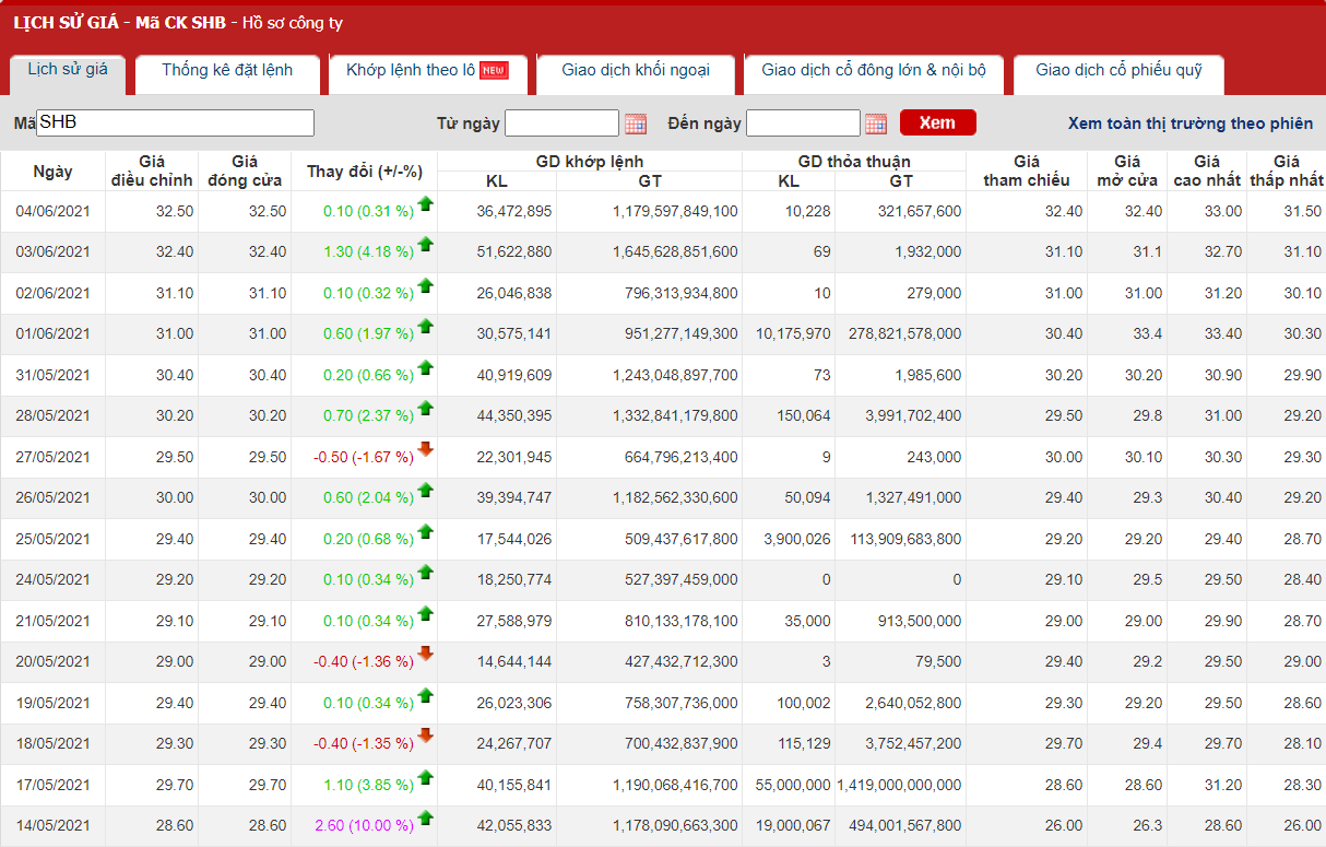 Thị giá cổ phiếu SHB từ phiên giao dịch 14/5 đến 4/6. Nguồn: Cafef.