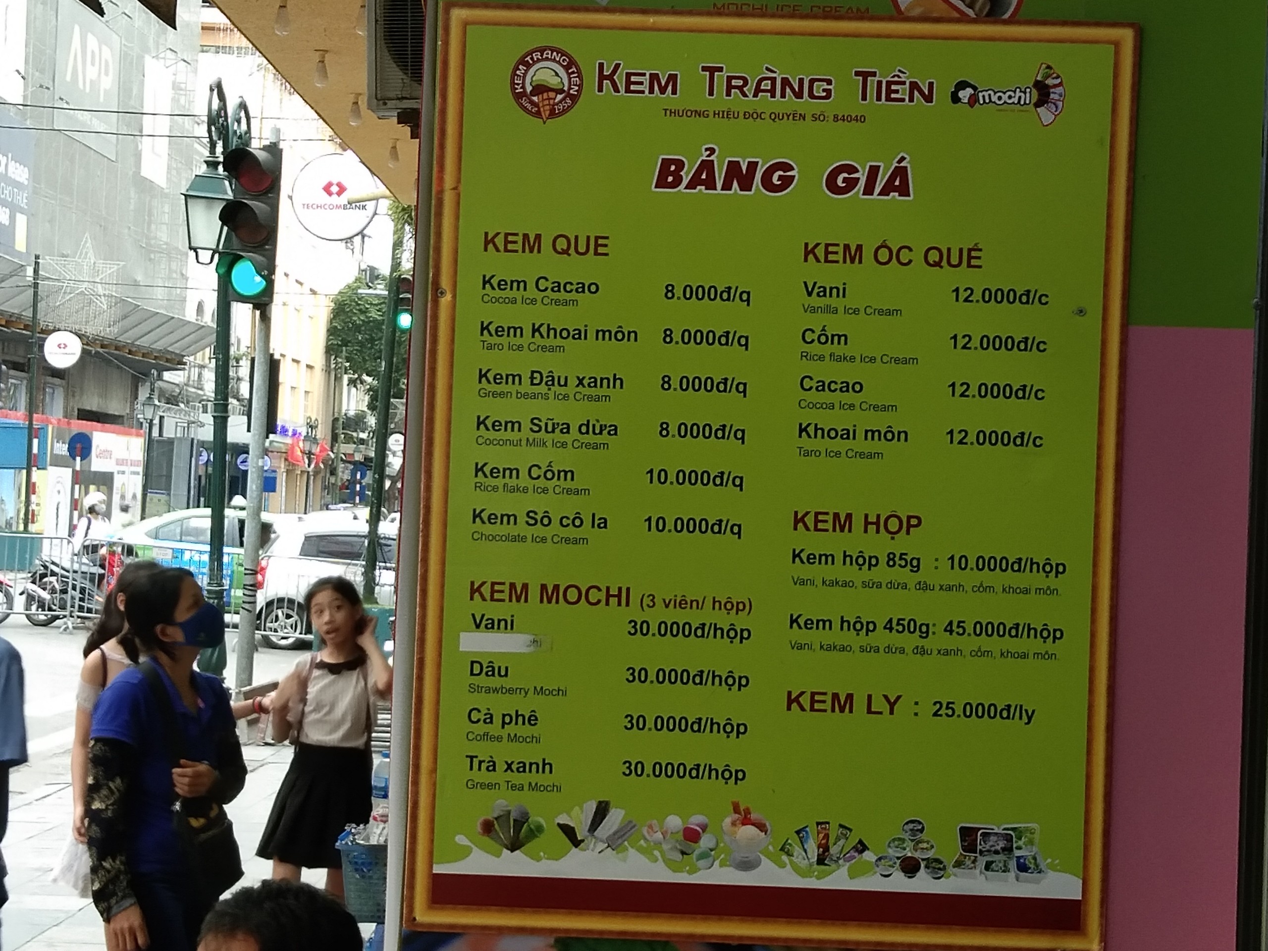 Bảng giá các loại kem tại cửa hàng số 35 Tràng Tiền.Kem Tràng Tiền ngoài hương vị đặc trưng còn thu hút khách nhờ giá cả phải chăng. Chỉ mất từ 8.000 - 12.000 đồng là có thể sở hữu những que kem ngọt mát. Tuy nhiên, khi mua theo hộp tùy loại thì cũng chỉ phải bỏ ra từ 10.000 - 45.000 đồng là có thể thỏa thích thưởng thức kem.