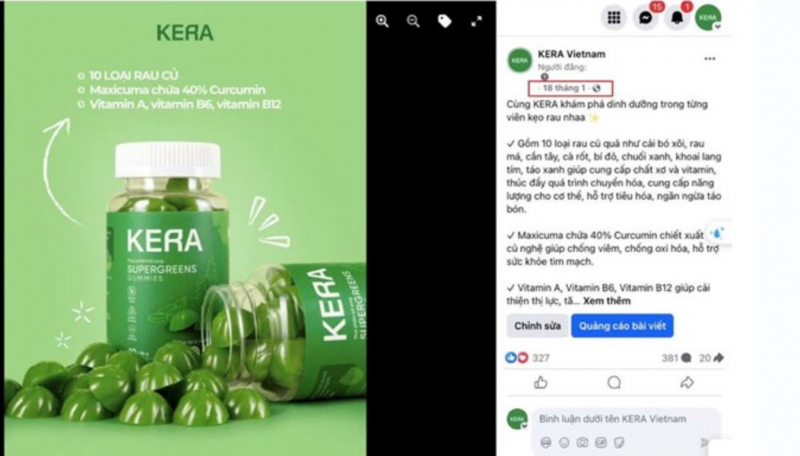 Ngày 20/3, Cục An toàn thực phẩm (Bộ Y tế) cho biết đã phát hiện quảng cáo quá mức về sản phẩm thực phẩm bổ sung SUPERGREENS GUMMIES (kẹo rau củ Kera) trên các nền tảng mạng xã hội. Một số nội dung quảng cáo như "1 viên này bằng 1 bó rau luôn" hay "chỉ cần ăn 2-3 viên mỗi ngày là đủ chất xơ" đã gây nhiều tranh cãi.