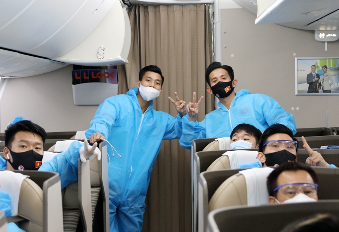 Trên chuyến bay trở về Việt Nam, đội tuyển được bố trí tại một khoang riêng, tách biệt với nhóm hành khách phía sau 6 hàng trống, mặc trang bị phòng hộ trong suốt hành trình bay và cho tới khi về tới địa điểm cách ly tập trung y tế.