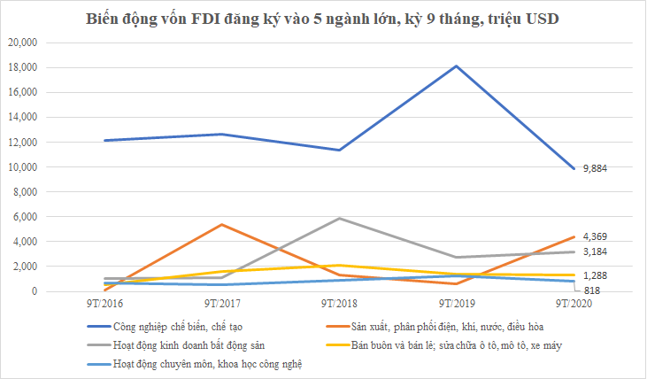 6 ngành có vốn FDI tăng trưởng 9 tháng đầu năm 2020.