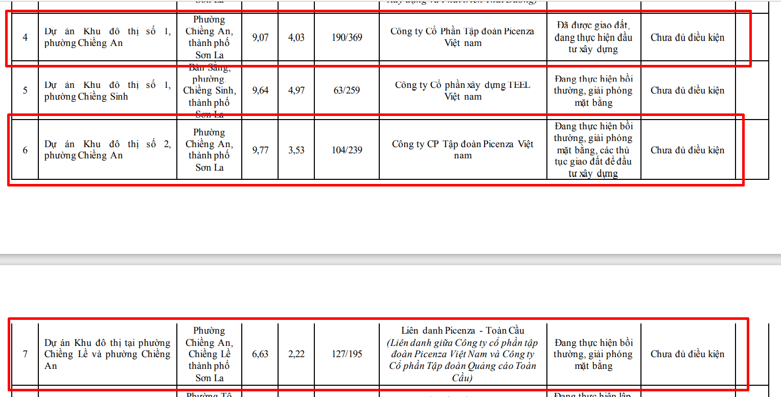 Ngoài dự án trên Picenza cũng còn 2 dự án khác cũng chưa đủ điều kiện huy động vốn, bán nhà ở hình thành trong tương lai gồm Dự án Khu đô thị số 1, phường Chiềng An; Dự án Khu đô thị số 2 phường Chiềng An, Thành phố Sơn La.