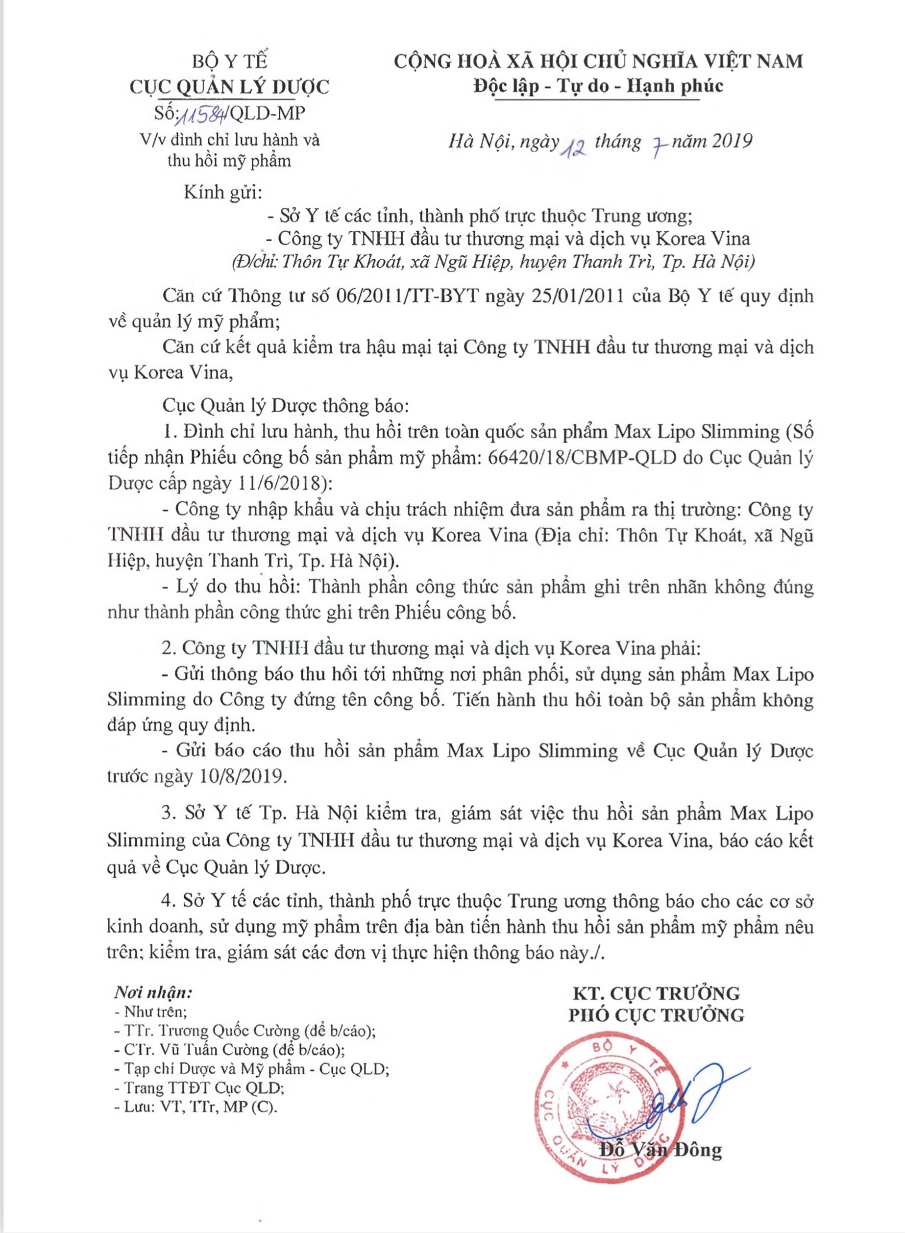 Theo Cục Quản lý Dược, căn cứ kết quả kiểm tra hậu mại tại Công ty TNHH đầu tư thương mại và dịch vụ Korea Vina, Cục Quản lý Dược đã thông báo đình chỉ lưu hành, thu hồi trên toàn quốc sản phẩm mỹ phẩm giảm béo Max Lipo Slimming (số tiếp nhận Phiếu công bố sản phẩm mỹ phẩm: 66420/18/CBMP-QLD do Cục Quản lý Dược cấp ngày 11/6/2018).