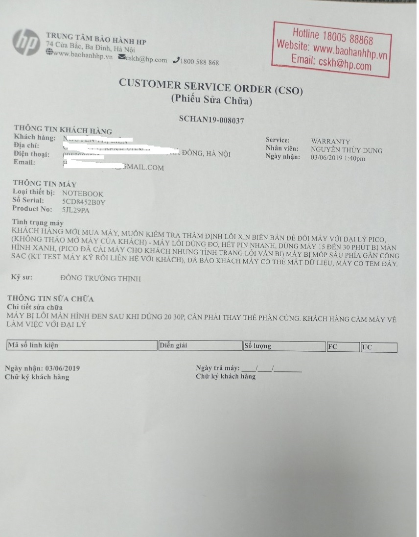 Ngày 3/6/2019, chị L. đã mang máy tới trung tâm bảo hành HP (phố Cửa Bắc, Ba Đình, Hà Nội) để nhân viên của hãng kiểm tra lỗi sản phẩm. Đến ngày 4/6/2019, chị L. nhận lại sản phẩm và phía hãng có gửi lại phiếu sửa chữa. Trong đó, có đề cập về tình trạng máy: “Khách hàng mới mua máy, muốn kiểm tra thẩm định lỗi xin biên bản để đổi máy với đại lý Pico. Máy lỗi do dùng bị đơ, hết pin nhanh, dùng máy 15p đến 30p bị màn hình xanh (Phía Pico đã cài lại máy cho khách hàng nhưng máy vẫn bị tình trạng lỗi như ban đầu), máy bị móp sâu gần cổng sạc (phía kỹ thuật đã test máy kỹ rồi liên hệ lại với khách)... Đặc biệt, trong phiếu sửa chữa cũng ghi rõ: “Máy bị lỗi màn hình đen sau khi dùng 20p - 30p, cần phải thay thế phần cứng, khách hàng cầm máy về làm việc với đại lý”.