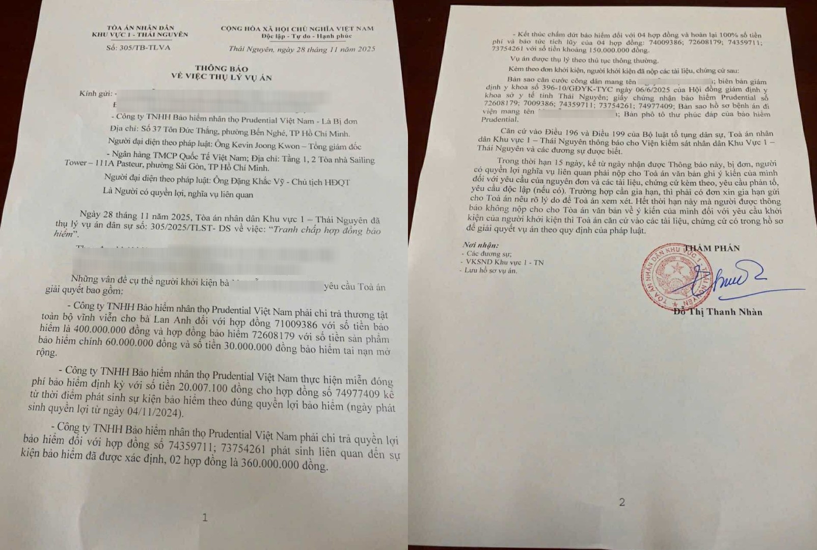 Theo thông báo thụ lý vụ án của Tòa án Nhân dân Khu vực 1 – Thái Nguyên, ngày 28/11/2025, Tòa án đã chính thức thụ lý vụ án dân sự số 305/2025/TLST-DS về việc “tranh chấp hợp đồng bảo hiểm” theo đơn khởi kiện của bà N.T.L.A (SN 1982, trú tại phường Phan Đình Phùng, tỉnh Thái Nguyên).