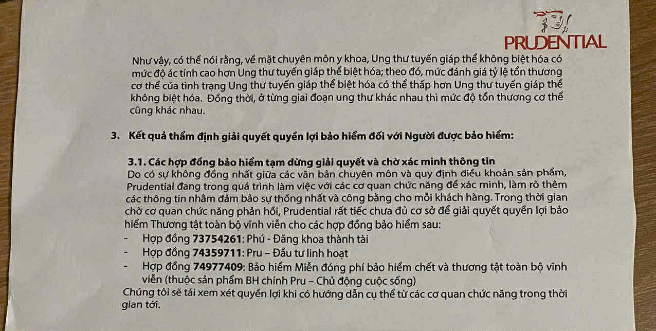 Tuy nhiên, bà N.T.L.A cho biết, Prudential không ban hành văn bản pháp lý cụ thể để giải thích lý do từ chối, nhưng vẫn khẳng định khách hàng “không đủ điều kiện” hưởng quyền lợi. Công ty viện dẫn Quyết định 1514/QĐ-BYT của Bộ Y tế – một văn bản hướng dẫn chuyên môn lâm sàng – để cho rằng bà chỉ mắc ung thư giai đoạn I và không đáp ứng điều kiện hợp đồng.