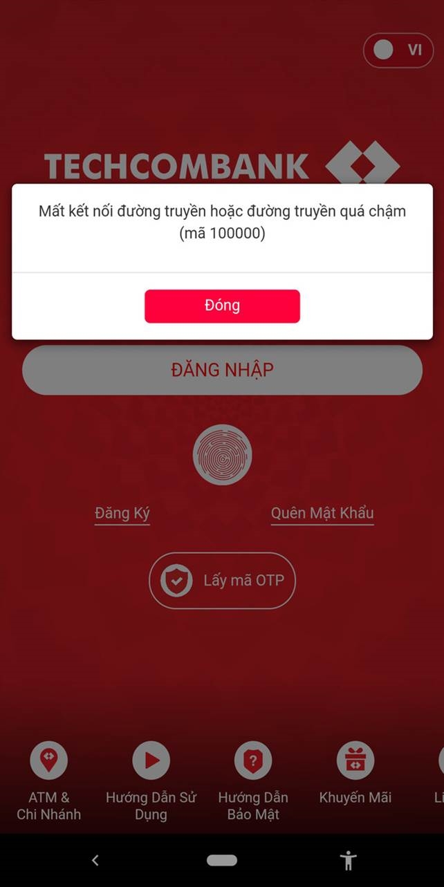 Trong ngày 4/5, hệ thống của Ngân hàng TMCP Kỹ Thương Việt Nam (Techcombank) gặp trục trặc. Người dùng không thể đăng nhập qua ứng dụng trên điện thoại và nhận được thông báo: "Mất kết nối đường truyền hoặc đường truyền quá chậm (mã 100000)".