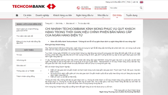 Thông tin về sự việc được đăng tải trên trang web chính thức của Techcombank. Ảnh chụp màn hình.