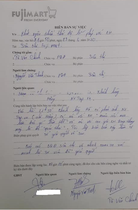 Sự việc cụ thể, vào hồi 21h50 khách hàng tên H. có phản ánh nhân viên tạp vụ tên Hằng có nói muộn rồi mua làm đ*** gì lắm thế, đồ quái thai. Tôi lập biên bản này có cơ sở giải quyết về sau” – đại diện Siêu thị FujiMart là ông Tạ Văn Chinh (Phó Giám đốc siêu thị).