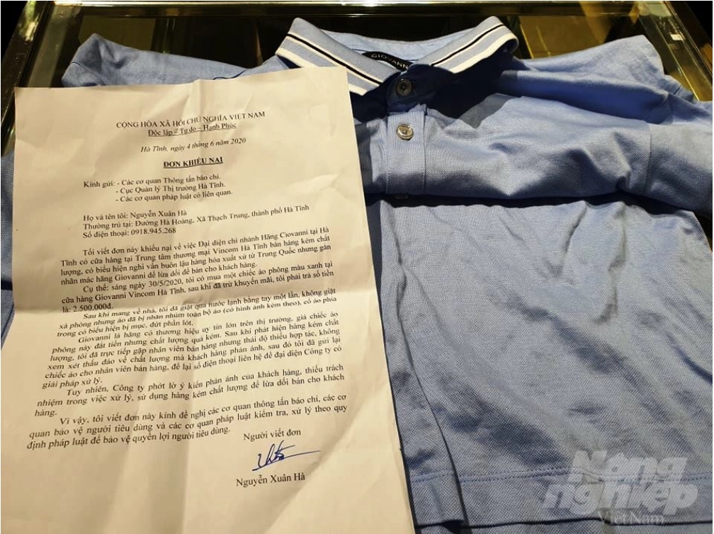 “Giovanni là hãng có thương hiệu, uy tín lớn trên thị trường, giá chiếc áo phông này đắt tiền nhưng chất lượng quá kém”, trích đơn khiếu nại.