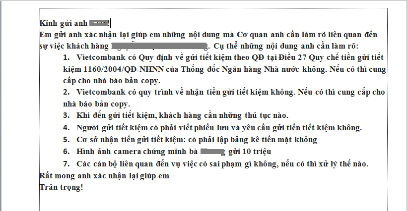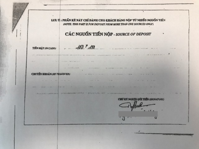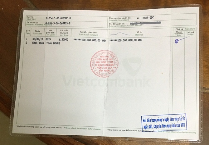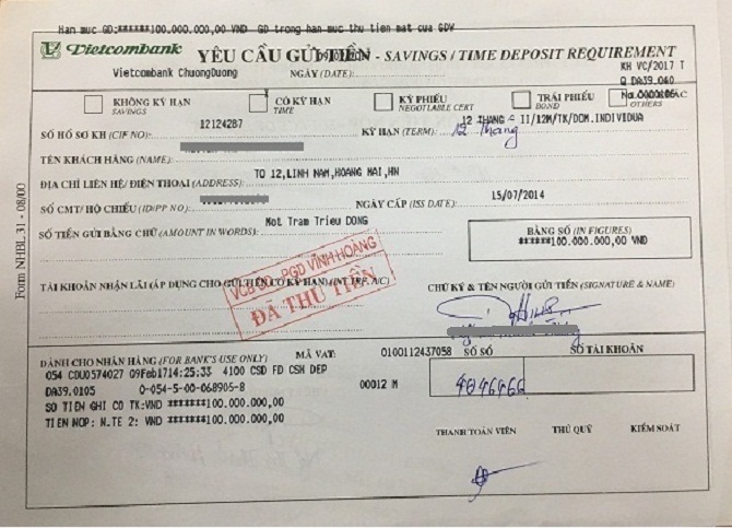 Tài liệu Vietcombank gửi cho phóng viên không thể hiện và không đủ minh chứng khách hàng gửi những mệnh giá tiền gì và tổng số bao nhiêu tiền |