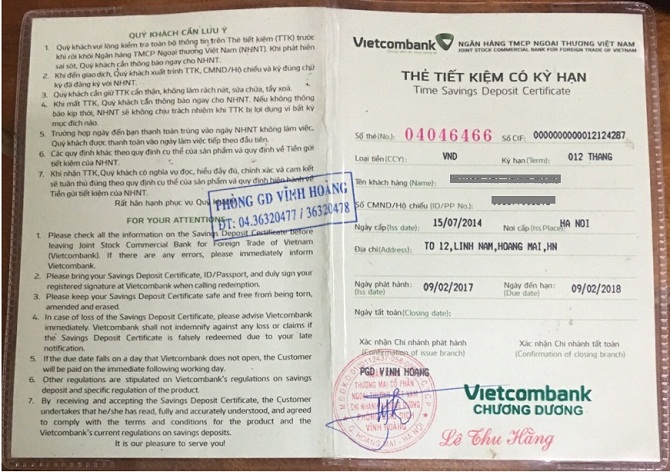 | Sổ tiết kiệm của khách hàng |