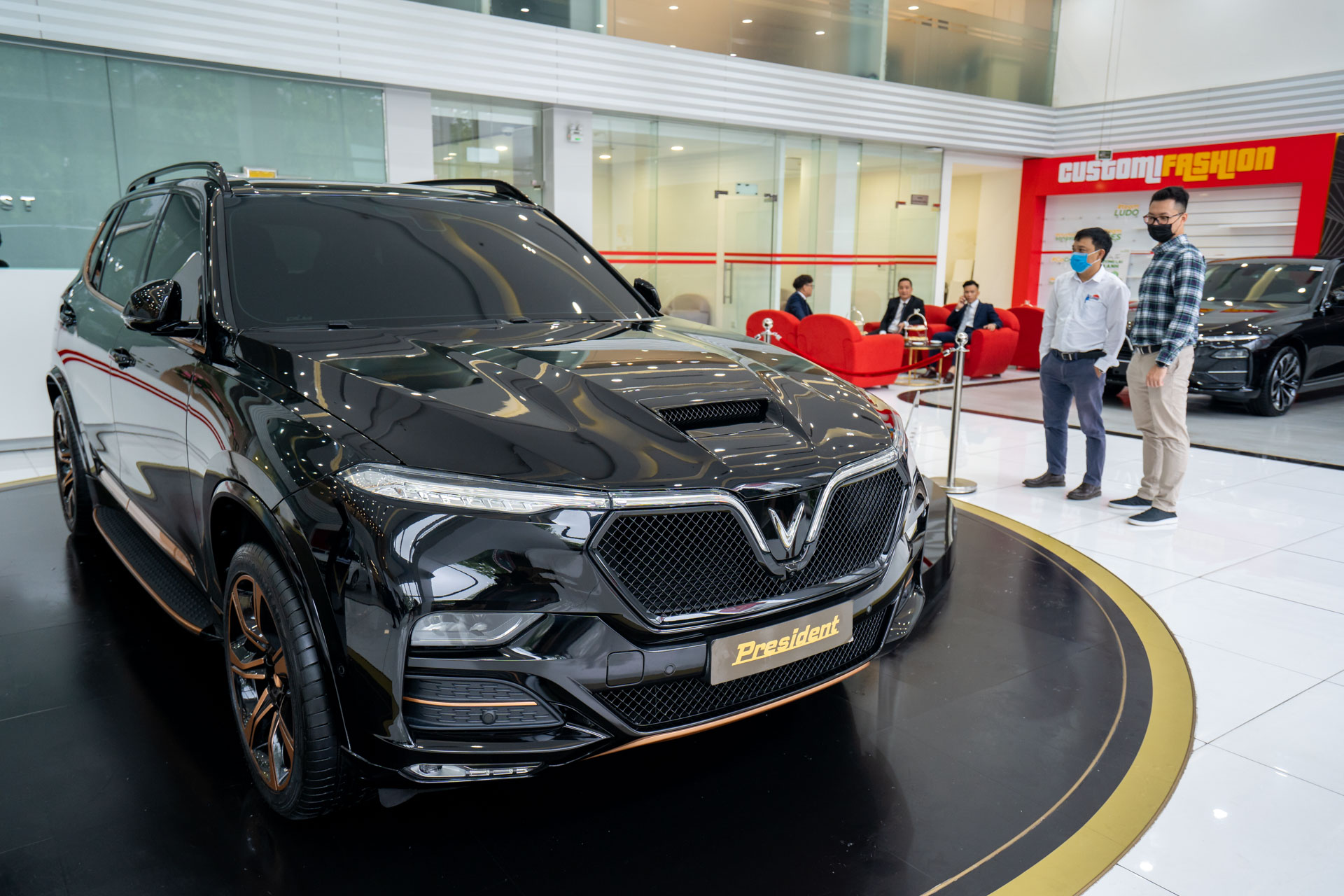 Showroom VinFast Hải Phòng (TTTM Vincom Plaza Imperia Hải Phòng) chật cứng khách trong ngày ra mắt President. So với “người anh” Lux SA, President được đánh giá là “cơ bắp” và “hầm hố” hơn, giống như những chiếc SUV hạng sang của Mỹ với hốc hút gió trên nắp capô, lưới tản nhiệt dạng mắt cáo cùng các đường gân dập nổi hai bên thân xe, không chỉ tôn lên vẻ mạnh mẽ mà còn giúp tối ưu tính khí động học cho xe. Ở phía sau, xe được trang bị cặp ống xả kép cỡ lớn đậm chất thể thao, hỗ trợ động cơ V8 vận hành trơn tru và đạt hiệu suất tốt.