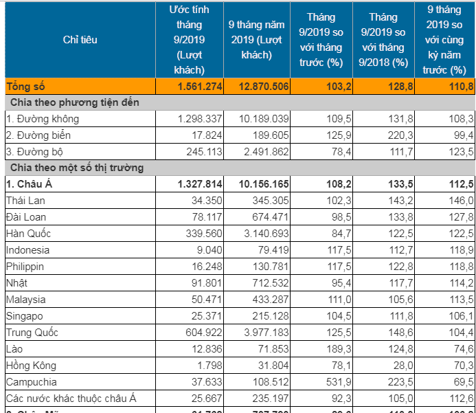 Thông tin từ Tổng cục Du lịch (Bộ Văn hóa, Thể thao và Du lịch) cho biết: Ước tính số lượng khách quốc tế đến Việt Nam tháng 9/2019 đạt 1.561.274 lượt, tăng 28,8% so với tháng 9/2018. Tính chung 9 tháng năm 2019, tổng lượng khách quốc tế đến Việt Nam ước đạt 12.870.506 lượt khách, tăng 10,8% so với cùng kỳ năm 2018.