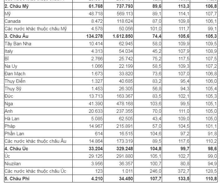 Khách đến từ châu Mỹ đạt 737,8 nghìn lượt người, tăng 6,8% so với cùng kỳ năm trước, chủ yếu là khách đến từ Hoa Kỳ đạt 569,1 nghìn lượt người, tăng 7,7%. Khách đến từ châu Úc đạt 329,2 nghìn lượt người, giảm 1,4%, trong đó khách đến từ Ôx-trây-li-a đạt 291,9 nghìn lượt người, giảm 1%. Khách đến từ châu Phi đạt 34,5 nghìn lượt người, tăng 10,8% so với cùng kỳ năm 2019.