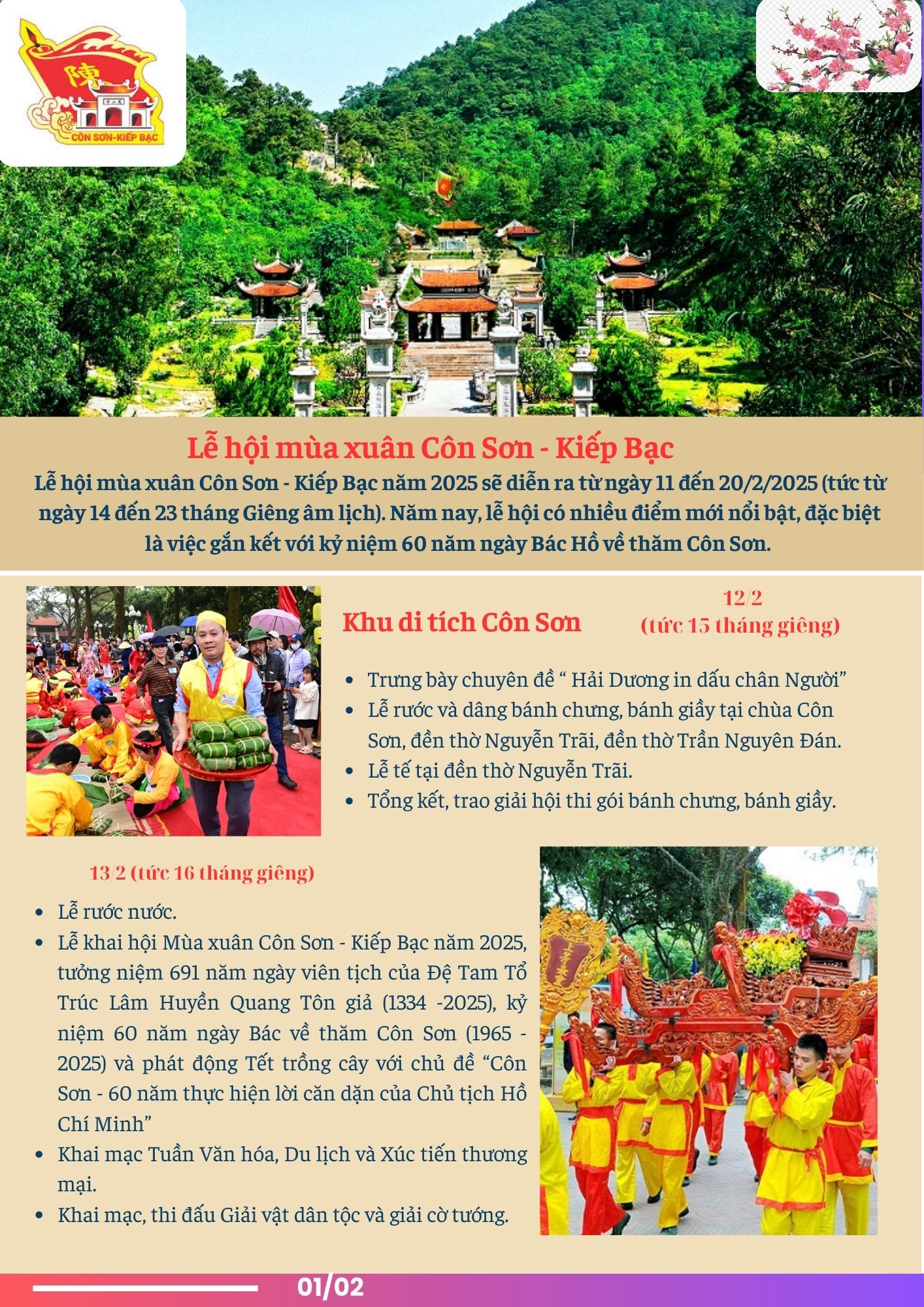 Khai Hội mùa Xuân Côn Sơn - Kiếp Bạc năm 2025, tưởng niệm 691 năm ngày viên tịch của Đệ Tam Tổ Trúc Lâm Huyền Quang Tôn giả (1334 - 2025), kỷ niệm 60 năm Ngày Bác Hồ về thăm Côn Sơn (1965 - 2025) và phát động “Tết trồng cây”.