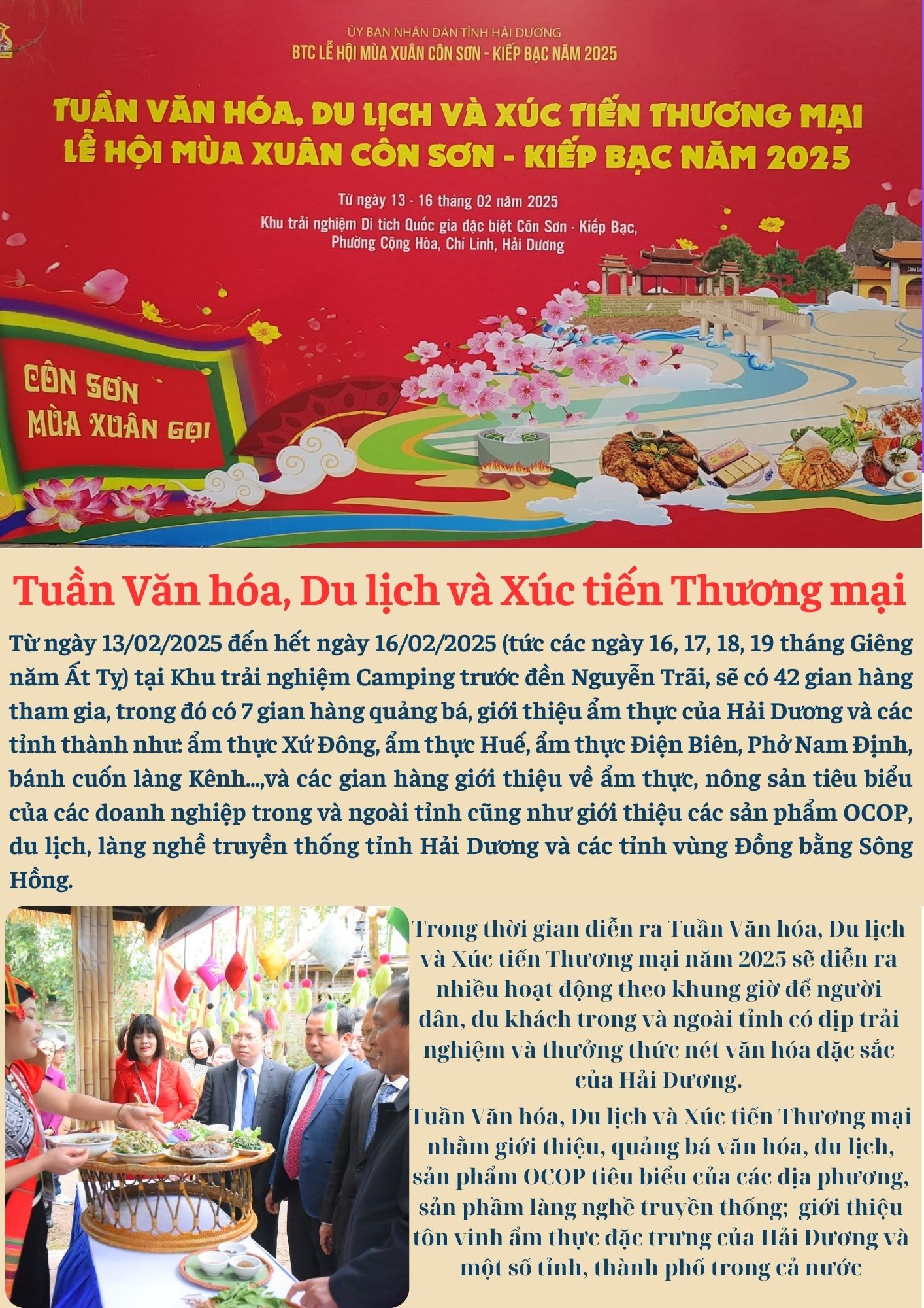 Tuần Văn hóa, Du lịch và Xúc tiến Thương mại được khai mạc vào sáng ngày 13/2 (16 tháng Giêng), ngay sau Lễ khai hội mùa Xuân Côn Sơn – Kiếp Bạc năm 2025.