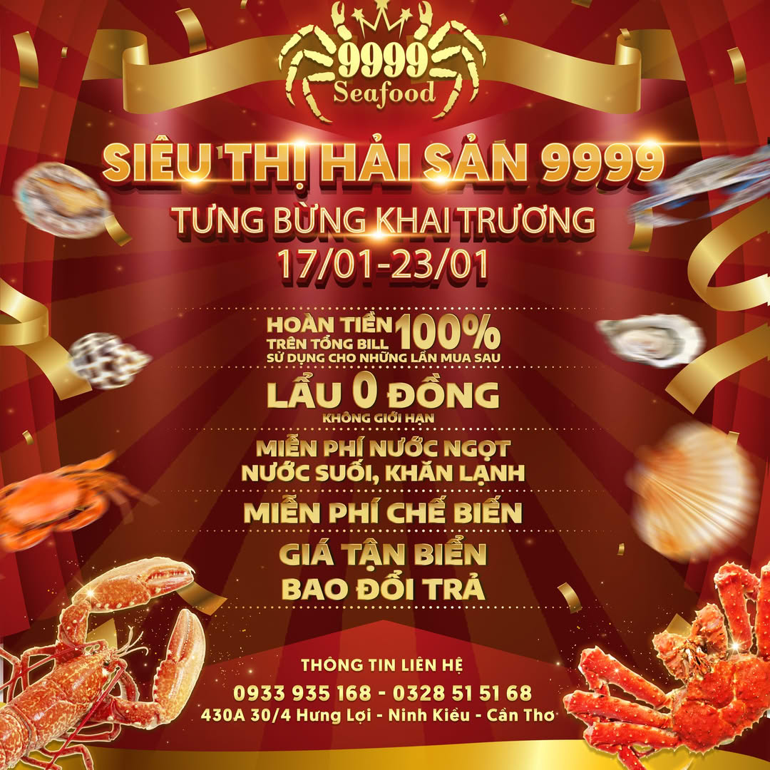 Ngày 17/1/2025 sắp tới, tại 430A đường 30/4 (Phường Hưng Lợi, Quận Ninh Kiều, TPCần Thơ) sẽ chính thức khai trương “Siêu thị hải sản 9999” - một trong những địa điểm mua sắm và thưởng thức hải sản lớn nhất khu vực Đồng bằng sông Cửu Long.