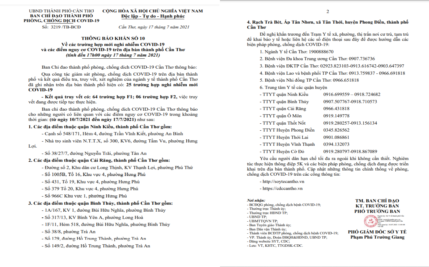 Thông báo khẩn số 10 của Ban Chỉ đạo phòng, chống dịch Covid-19 TP Cần Thơ.