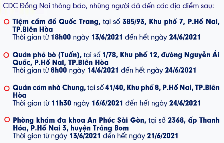 CDC Đồng Nai đề nghị tất cả những người đến các địa điểm sau cần liên hệ ngay với Trạm Y tế tại địa phương để khai báo y tế và được hướng dẫn phòng chống dịch COVID-19 kịp thời. Cài đặt ứng dụng Bluezone để được cảnh báo nguy cơ lây nhiễm COVID-19 tại https//bluezone.gov.vn