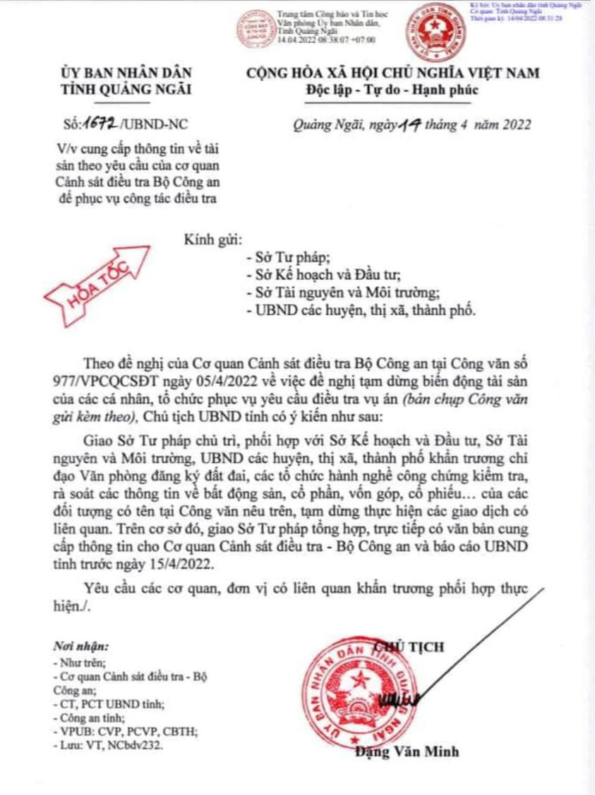 Theo đó, Bộ Công an đã có công văn đề nghị tỉnh Quảng Ngãi chỉ đạo các cơ quan đơn vị tạm dừng biến động tài sản của một số cá nhân, tổ chức ở tỉnh này vì liên quan đến vụ án mà đơn vị này đang thụ lý.