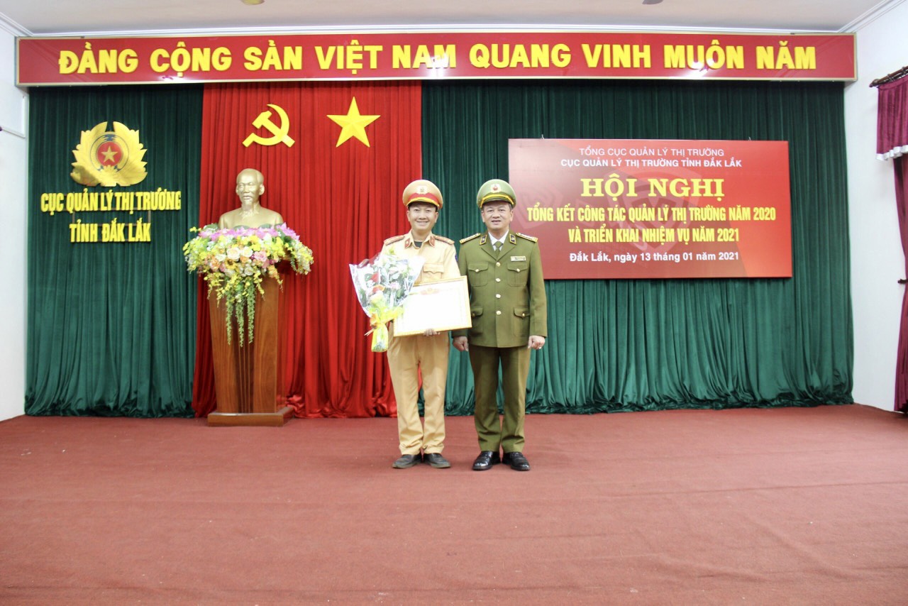 Ông Mai Mạnh Toàn, Cục trưởng Quản lý thị trường (QLTT) tỉnh Đắk Lắk tặng hoa và trao quyết định khen thưởng thưởng cá nhân chiến sỹ phòng CSGT Công an tỉnh Đắk Lắk trong vụ bắt xe khách vận chuyển nội tạng thối ở Đắk Lắk