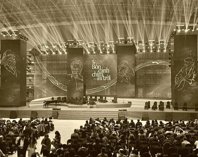 Poster chương trình âm nhạc Về đây bốn cánh chim trời, tôn vinh bốn nhạc sĩ Phạm Duy, Văn Cao, Trịnh Công Sơn và Trần Tiến, quy tụ những tên tuổi hàng đầu của làng nhạc Việt.