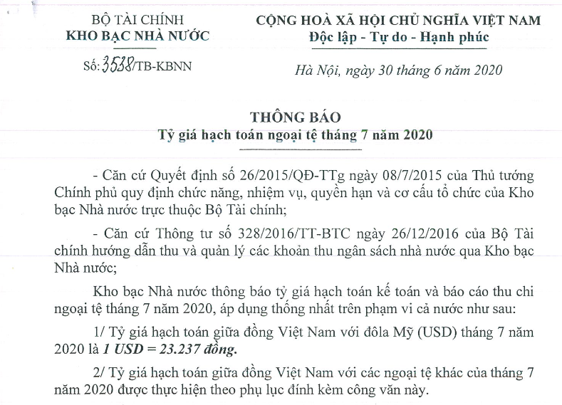 Thông báo số 3538/TB-KBNN về tỷ giá hạch toán ngoại tệ tháng 7/2020 của KBNN.