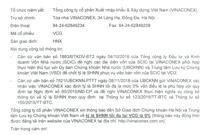 Mới đây, Tổng CTCP Vinaconex (mã VCG) đã có văn bản gửi Sở Giao dịch Chứng khoán Hà Nội (HNX), Trung tâm lưu ký chứng khoán Việt Nam (VSD) thông báo về việc giảm tỷ lệ sở hữu nước ngoài tối đa tại Vinaconex về 0%.