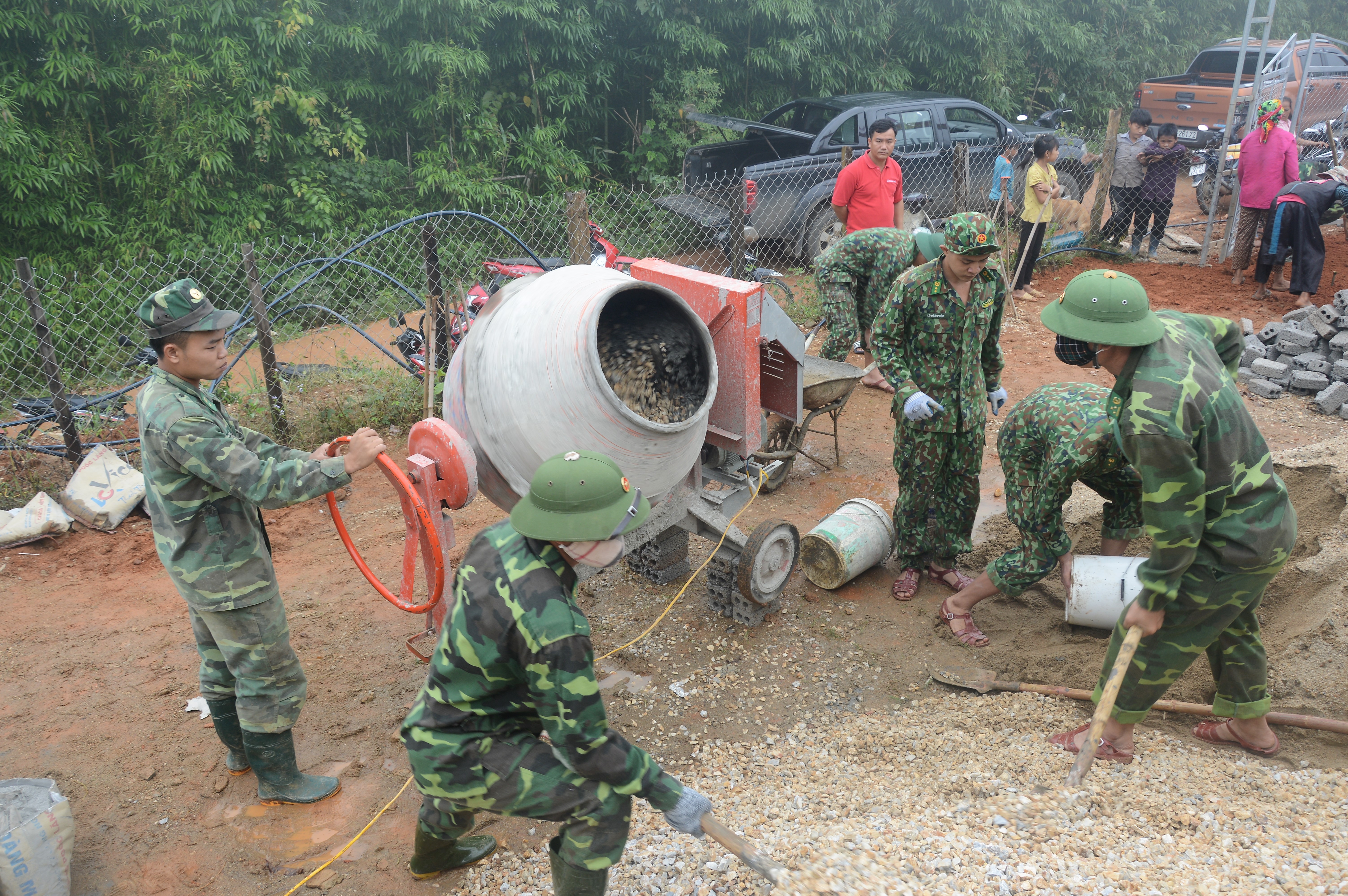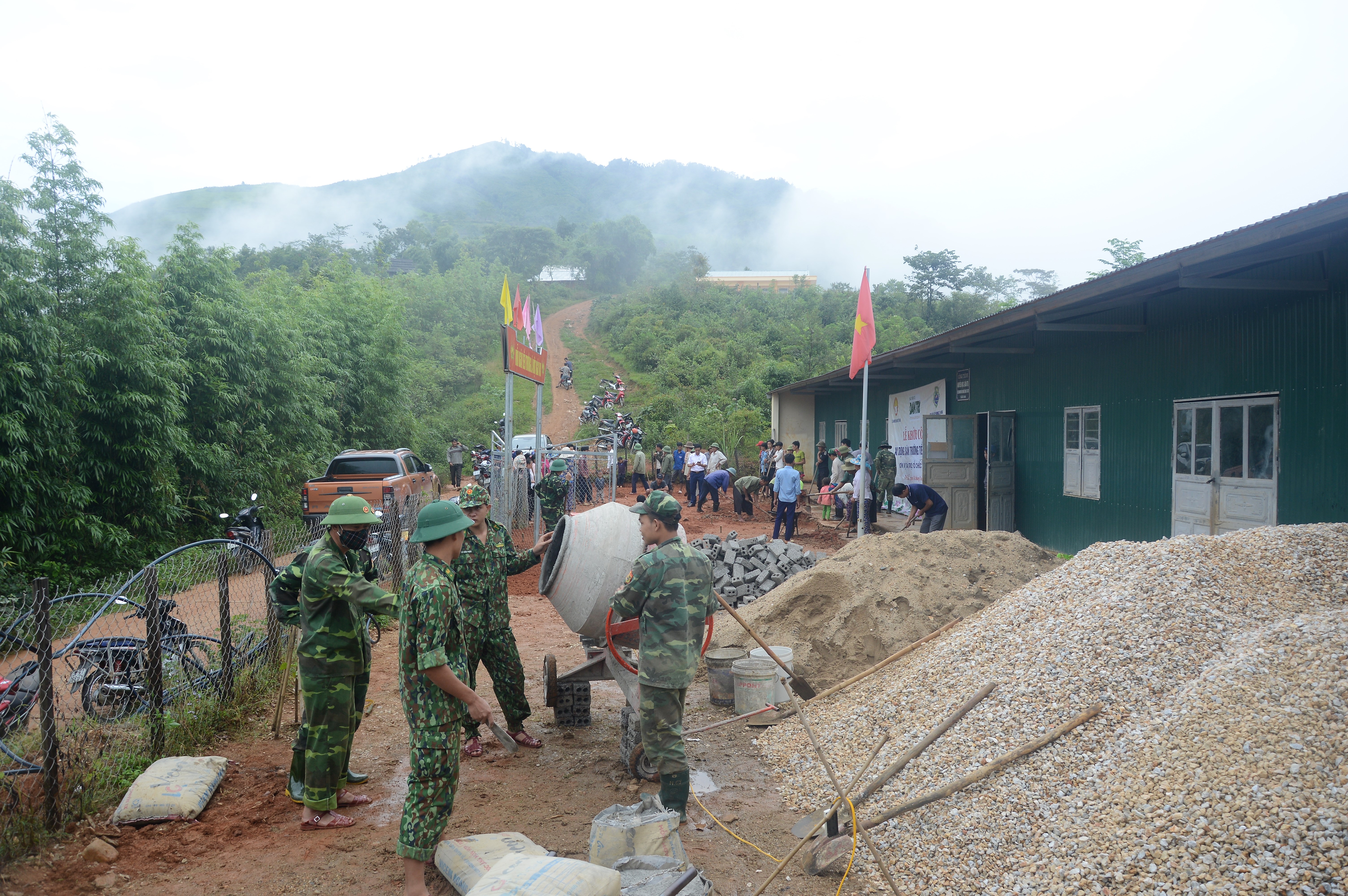 | Cán bộ chiến sỹ Đồn BP Tri Lễ và nhân dân địa phương thi công xây dựng sân trường Tiểu học Tri Lễ 2 (điểm bản Pà Khốm) |