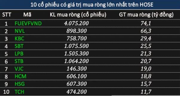 Top10 mã mua ròng trong phiên, chứng chỉ quỹ FUEVFVND ghi nhận giá trị mua ròng lớn nhất với 74,1 tỷ đồng. Theo sau, NĐT nước ngoài rót vốn vào các cổ phiếu NVL (66,3 tỷ đồng), KBC (29,4 tỷ đồng), SBT (25,5 tỷ đồng) và LPB (21,3 tỷ đồng).