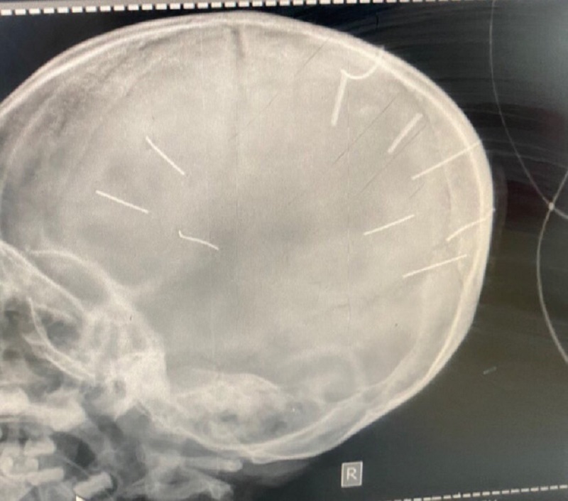 Ngay sau đó, các bác sĩ khoa cấp cứu đã chụp phim, làm chẩn đoán và phát hiện 9 dị vật giống đinh trong sọ não bé gái nên đã chuyển tuyến lên Bệnh viện đa khoa Xanh Pôn, đồng thời báo Công an huyện Thạch Thất.