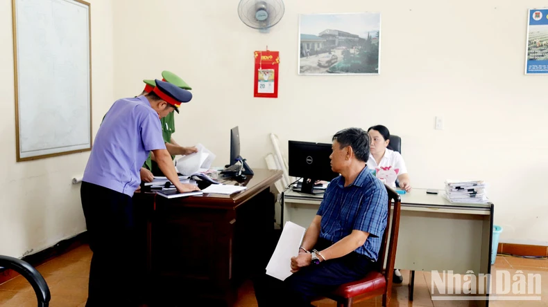 Cơ quan chức năng tống đạt quyết định khởi tố, bắt tạm giam bị can Lê Đình Thuần và Nguyễn Hữu Giảng. (Ảnh: Báo Nhân dân)