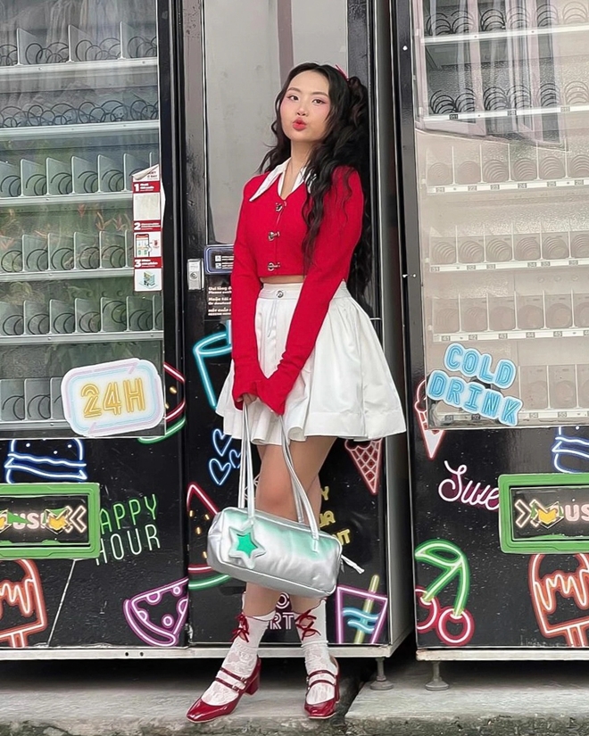 Diện áo cardigan đỏ dáng lửng, chân váy xếp ly trắng, tất ren và giày Mary Jane ton-sur-ton, Phương Mỹ Chi hóa thân thành một “teen girl” phong cách Hàn Quốc. Điểm nhấn là chiếc túi xách ánh kim và tóc buộc nơ, vừa dễ thương vừa hợp xu hướng.