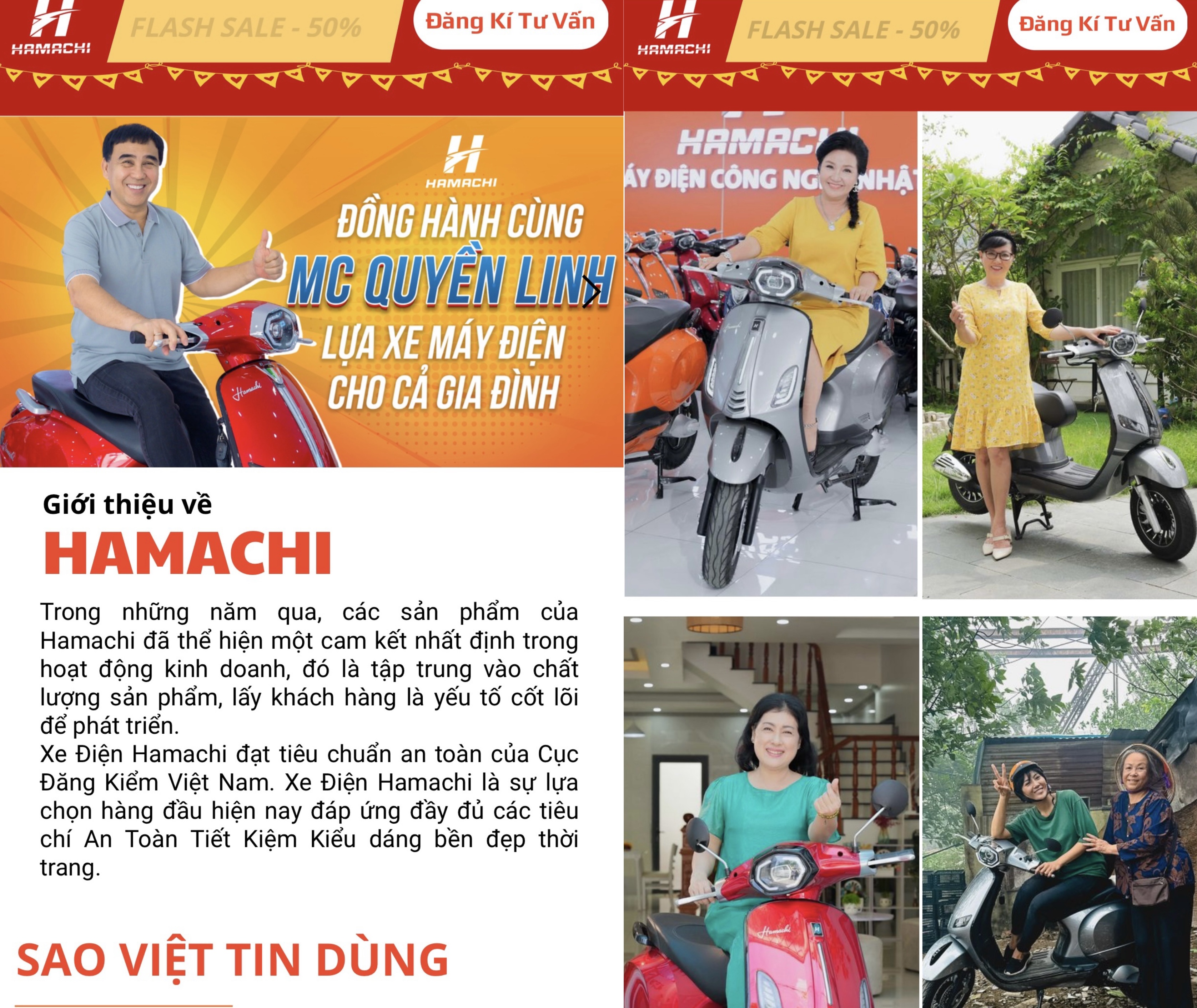 Trên website hamachi.vn thuộc sở hữu của Công ty TNHH Hamachi Việt Nam giới thiệu chuỗi hệ thống gồm 24 showroom có tại 14 tỉnh, thành phố. Đáng chú ý, website này đăng tải hàng loạt hình ảnh của các diễn viên có tên tuổi của màn ảnh Việt Nam chụp, tạo dáng bên những chiếc xe mang thương hiệu của Hamachi. Các trích đoạn được đăng tải thể hiện cảm nhận tích cực, sự lan tỏa của các diễn viên khi trải nghiệm và lựa chọn sử dụng xe điện nhãn hiệu Hamachi mang lại niềm tin cho người sử dụng về chất lượng của các sản phẩm đăng quảng bá và bán trên website.