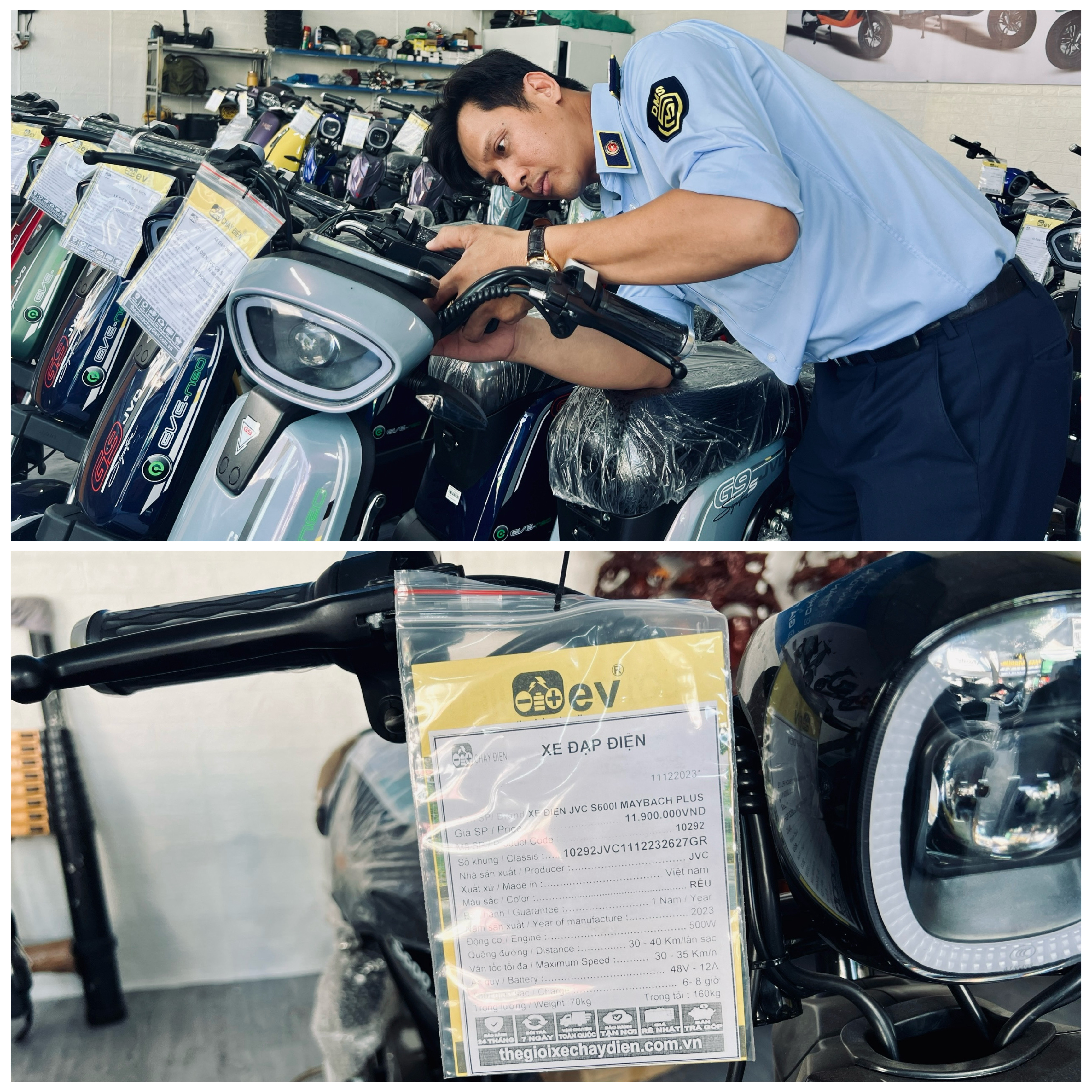 Đội QLTT số 12, Cục QLTT TP.HCM kiểm tra và thu giữ xe vi phạm tại cơ sở 222 Lê Văn Khương. Tại cơ sở này, lực lượng chức năng đã tạm giữ 30 xe đạp điện có dấu hiệu vi phạm.