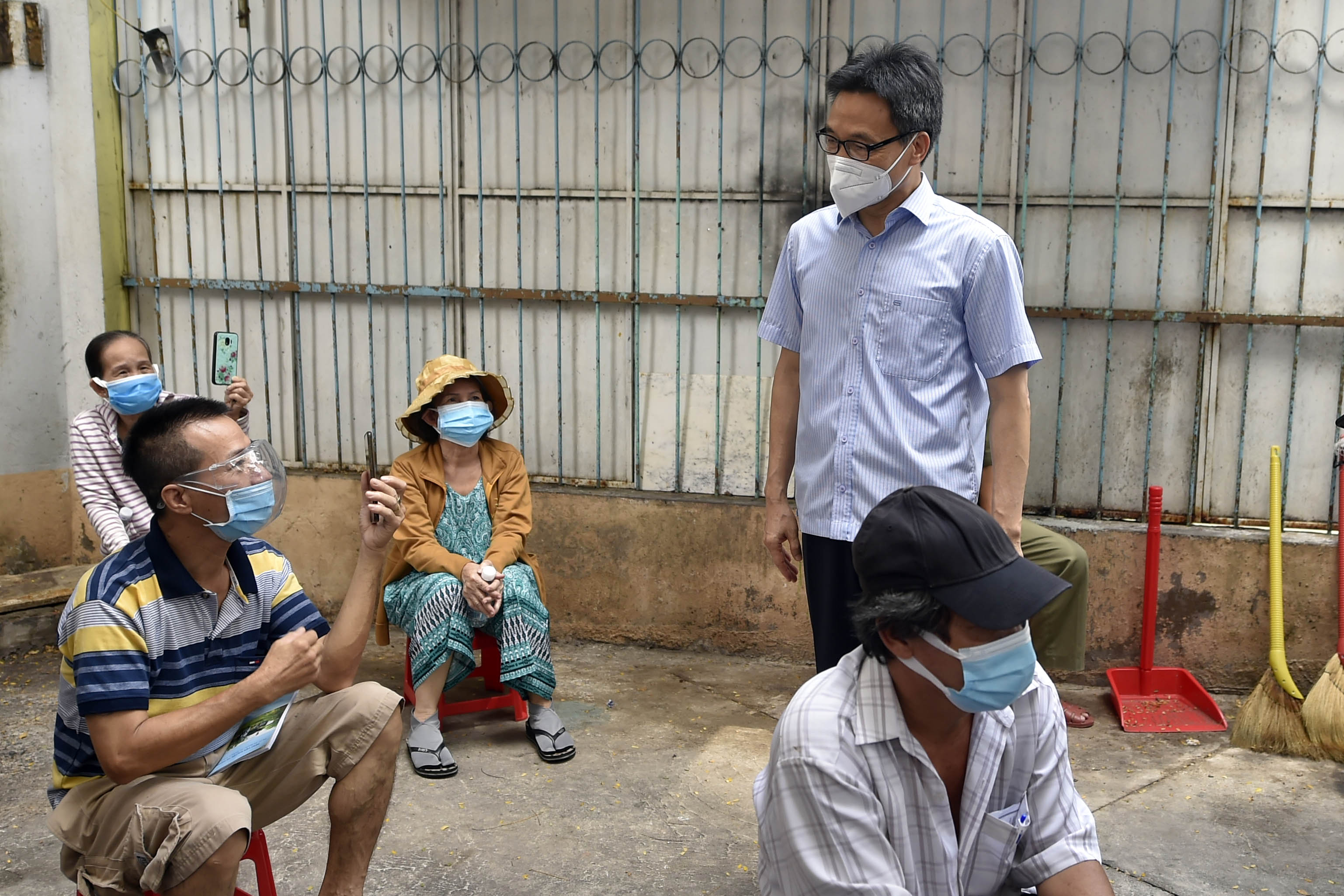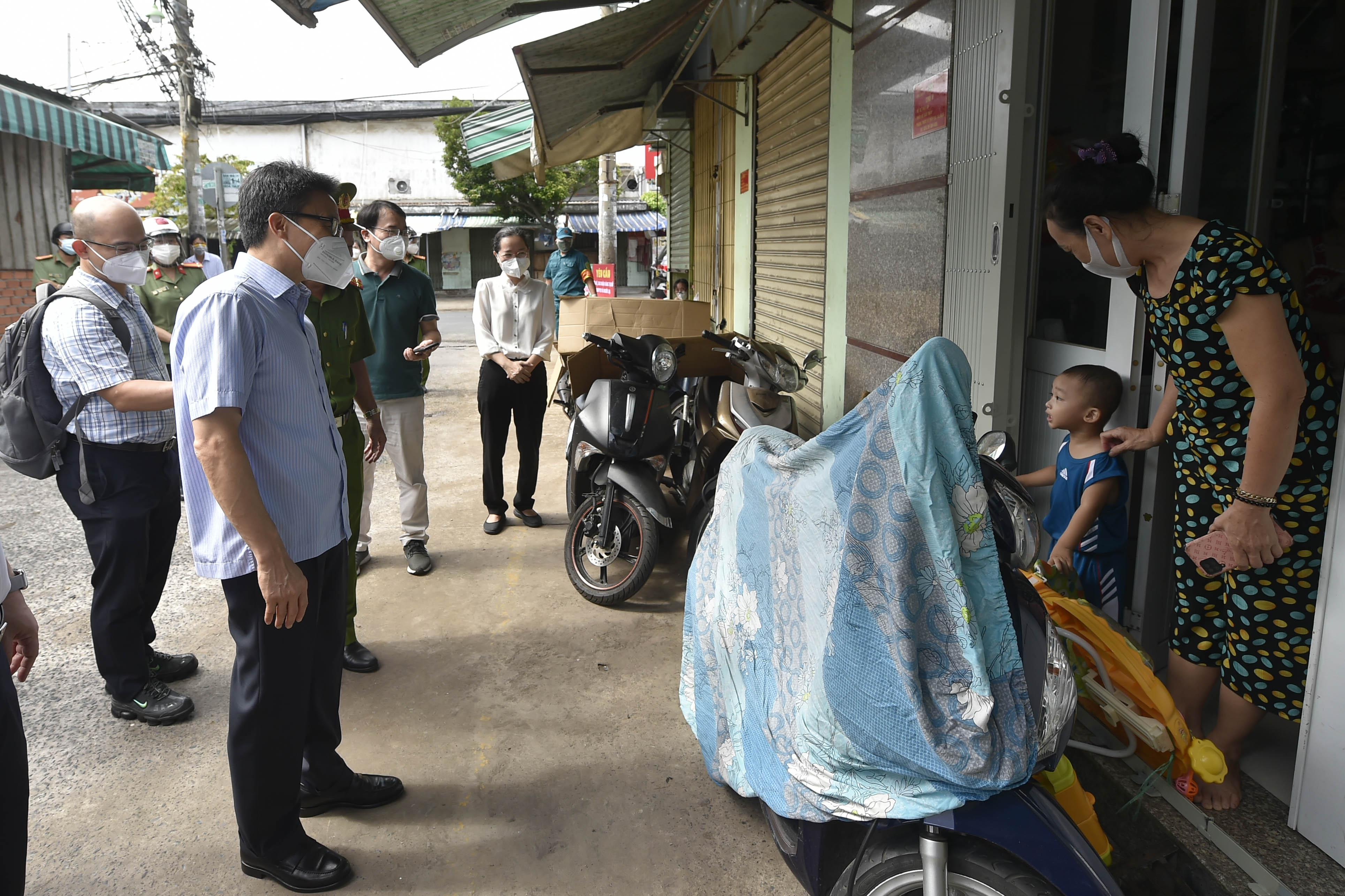 Phó Thủ tướng trò chuyện với gia đình anh Nguyễn Khắc Hiếu có người nhiễm COVID-19 đang điều trị tại nhà ở hẻm 76, đường Tôn Thất Thuyết, Quận 4. Ảnh: VGP/Đình Nam