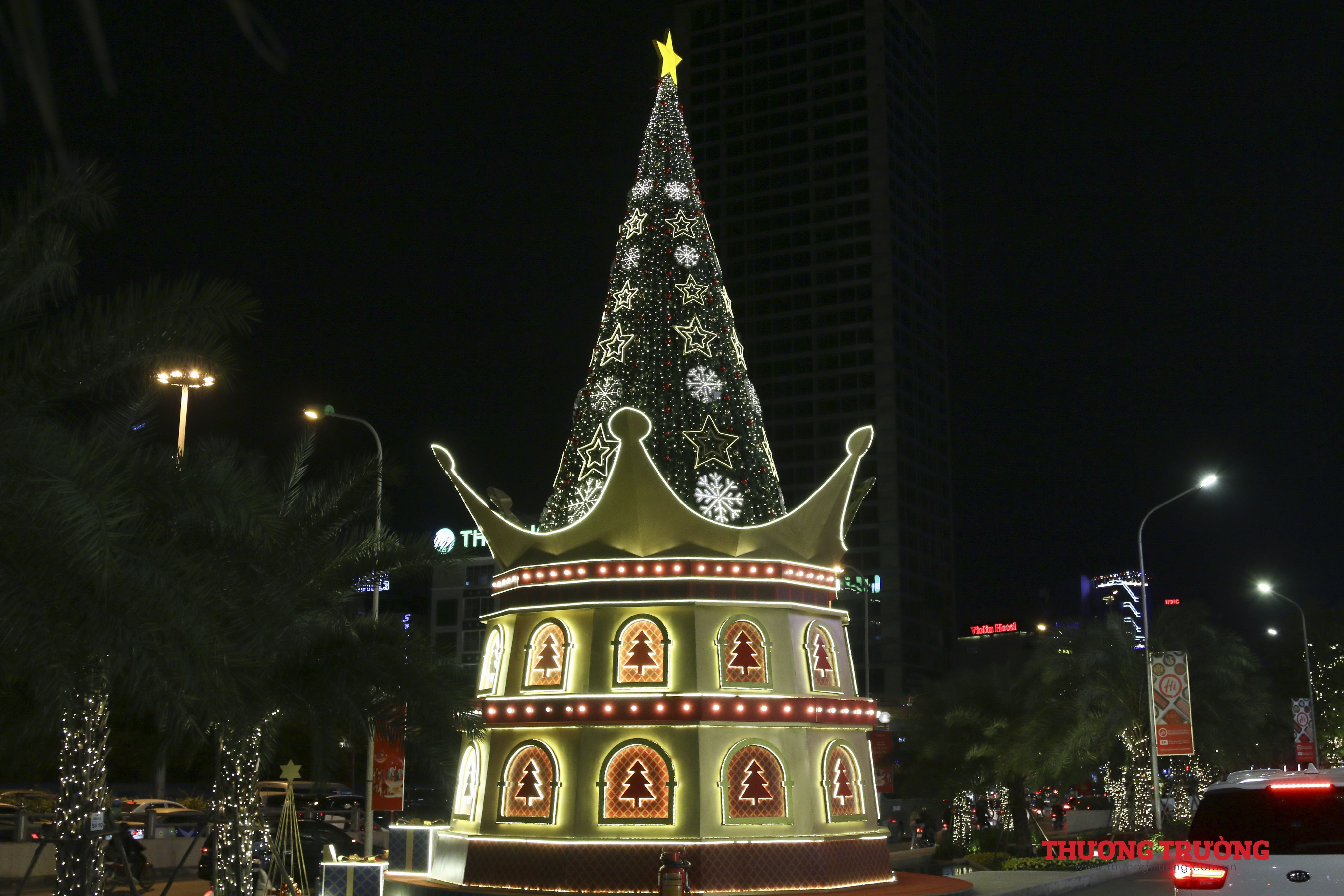 Về đêm ánh đèn lên cửa vào trung tâm thương mại Vincom trên đường Nguyễn Chí Thanh cũng được trang hoàng cây thông Noel và hệ thống đèn điện giăng khắp các cây xung quanh tại hình ảnh vô cùng lung linh.