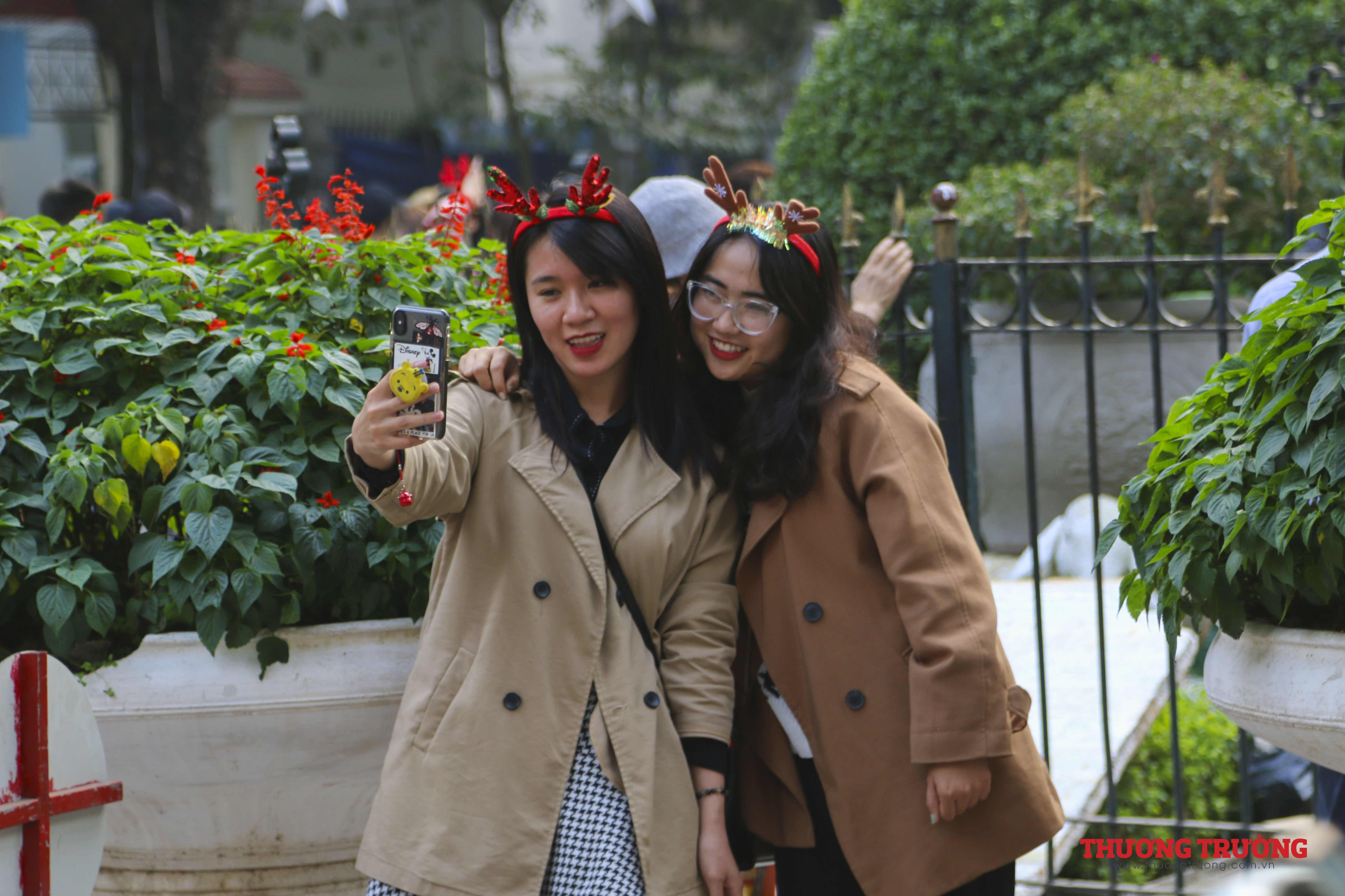 Nhóm bạn trẻ check-in bên cây thông Noel khổng lồ trước Nhà thờ Lớn Hà Nội.