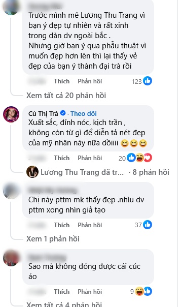 Khán giả cho rằng mỹ nhân VTV đã tiếp tục can thiệp thẩm mỹ để cải thiện nhan sắc ngày càng trẻ trung hơn. Tuy nhiên, dưới bài đăng, nhiều người để lại bình luận cảm thấy tiếc nuối cho nhan sắc trước kia của nữ diễn viên: "Trước mình mê Lương Thu Trang vì bạn ý đẹp tự nhiên và rất xinh trong dàn diễn viên ngoài Bắc, nhưng giờ bạn ý qua phẫu thuật vì muốn đẹp hơn lên thì lại thấy vẻ đẹp của bạn ý thành đại trà rồi", "Giờ tác động nhiều thay đổi diện mạo không còn nét đẹp riêng, nhìn mấy người đó toàn hao hao giống nhau nhìn chán mắt"...