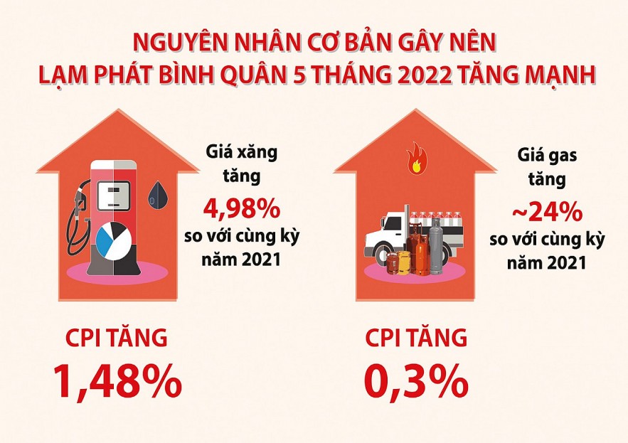 Nguyên nhân cơ bản gây nên lạm phát bình quân 2,25% đó là giá xăng dầu tăng liên tục và đứng ở mức cao. Riêng xăng dầu trong 5 tháng đầu năm 2022 đã tăng 4,98% so với cùng kỳ năm trước, tác động làm cho CPI tăng 1,48 điểm %. Bên cạnh đó giá gas trong nước 5 tháng đầu năm cũng tăng cao theo giá thị trường thế giới ở mức gần 24%, cũng đóng góp vào 0,3 điểm %. Như vậy, có thể thấy chỉ tính xăng dầu và gas đã đóng góp vào chỉ tiêu lạm phát là trên 2,1 điểm %. Xăng dầu và gas là nguyên nhân chính khiến lạm phát bình quân 5 tháng 2022 tăng mạnh.
