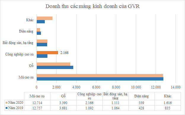 Trong khi đó, mảng kinh doanh chủ lực khai thác mủ cao su thiên nhiên chỉ còn ghi nhận 12.714 tỷ đồng, chiếm 60% tổng doanh thu (so với mức hơn 64% trong năm 2019). Mảng chế biến gỗ cũng giảm doanh thu về 3.390 tỷ đồng. Mảng xây dựng bất động sản và hạ tầng có doanh thu đi ngang.