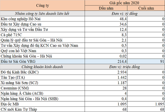 Trong năm qua, tập đoàn còn thoái toàn bộ vốn tại 8 khoản đầu tư khác là công ty Đầu tư Xây dựng Cao su, Xây dựng và Tư vấn Đầu Tư, Khu công nghiệp Hố Nai, Tư vấn Xây dựng đô thị KCN Cao su Việt Nam, công ty TNHH MTV Cà phê 715C, Chứng khoán Sài Gòn – Hà Nội, Quản lý quỹ đầu tư Sài Gòn – Hà Nội, Quỹ Con hổ Việt Nam.