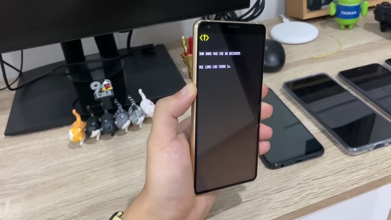 Nếu giữ phím reset lâu hơn thì điện thoại của bạn sẽ lập tức chuyển sang chế độ recovery, trên màn hình lập tức sẽ hiện lên một vài dòng chữ và thả khoảng 5 giây thì chiếc điện thoại của bạn sẽ lập tức chuyển sang chế độ recovery.