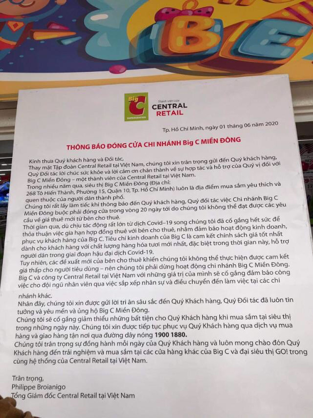 Tờ thông báo đóng cửa của Big C Miền Đông. Ảnh: Internet.