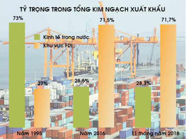 Tháng 8/2018 Tại hội thảo nâng cao giá trị sản phẩm - giải pháp tăng trưởng xuất khẩu bền vững. Các chuyên gia đánh giá, trong thời gian qua hoạt động xuất khẩu đã có sự tăng trưởng mạnh mẽ, đóng góp to lớn vào sự phát triển của nền kinh tế. Các chuyên gia cũng đánh giá, kim ngạch xuất khẩu hàng hóa vẫn chủ yếu xuất phát từ khu vực DN FDI, với tỷ trọng hơn 70% kim ngạch xuất khẩu của cả nước.