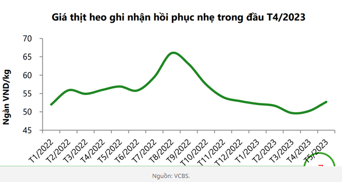 Trong báo cáo triển vọng ngành chăn nuôi heo cập nhật ngày 11/5, Chứng khoán Vietcombank (VCBS), cho biết sang nửa tháng 4/2023, giá thịt heo Việt Nam bắt đầu tăng nhẹ, dao động quanh mức 49.900-51.300 đồng/kg.