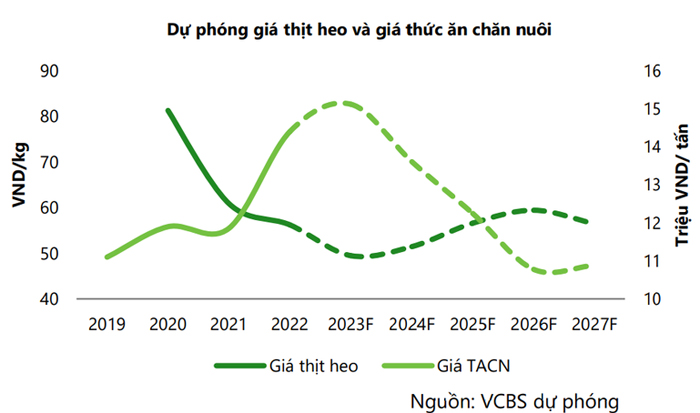 Với góc nhìn ngắn hạn, VCBS cho rằng, lạm phát hạ nhiệt từ cuối tháng 3, chi tiêu người dân có thể sớm phục hồi. Nguồn cung nội địa cuối năm được kỳ vọng sụt giảm mạnh trong bối cảnh giá heo giảm, giá thức ăn chăn nuôi neo ở mức cao khiến các hộ chăn nuôi (chiếm 38% sản lượng nội địa) e ngại tái đàn. Quy mô đàn nái tại Trung Quốc có dấu hiệu giảm, song năng suất tốt, theo đó nguồn cung thịt heo nước này được dự báo sẽ cao cho tới giữa năm, và giảm dần vào cuối năm.